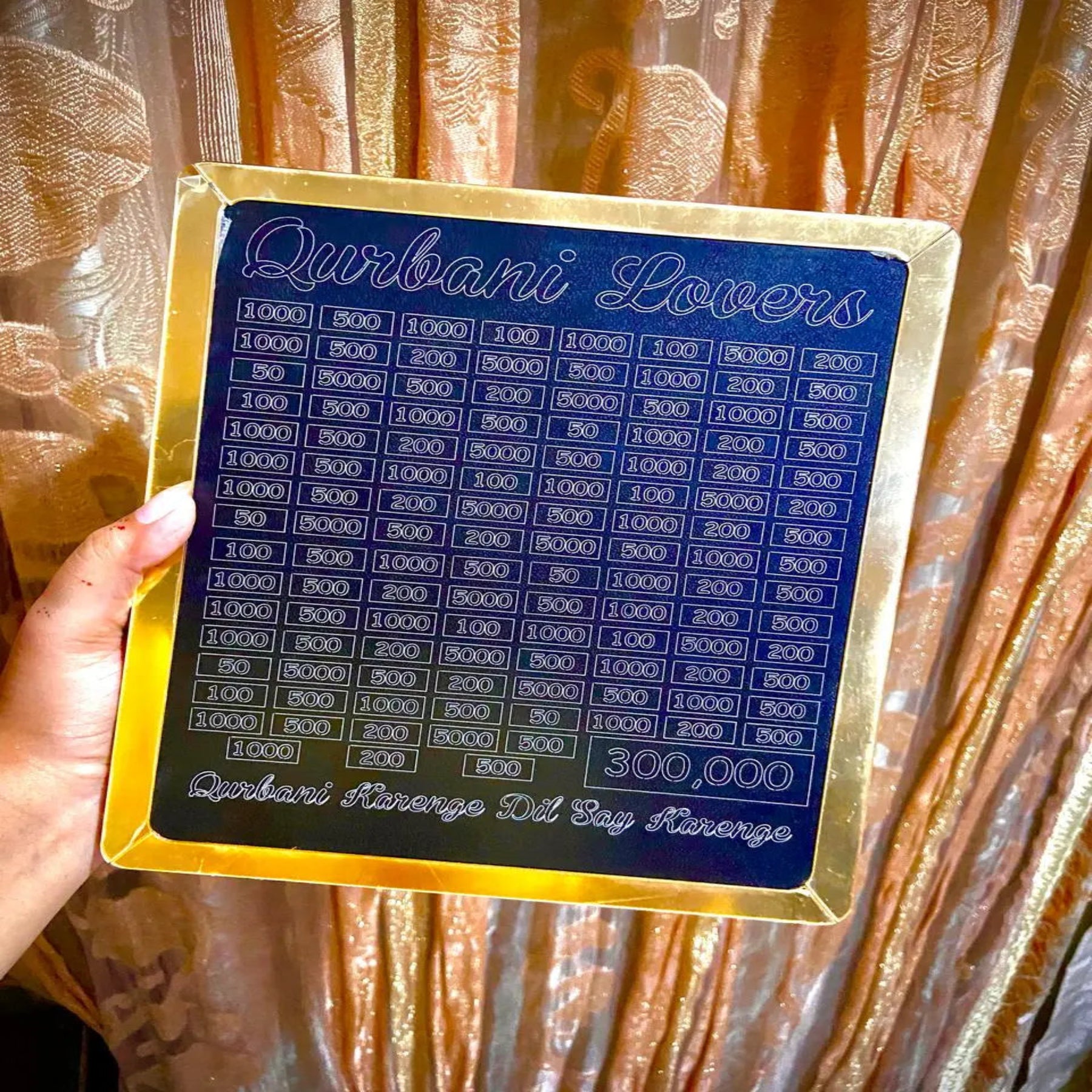 • Available in premium and classic stylesQurbani saving box with labeled currency slots, designed to help save up to 3 lakh PKR, featuring a motivational quote for Qurbani lovers.Qurbani saving box with labeled currency slots, designed to help save up to 3 lakh PKR, featuring a motivational quote for Qurbani lovers.